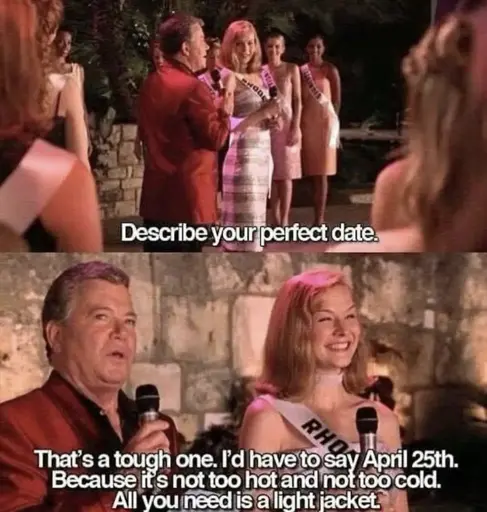 Lucky you. Though the weather here on average matches you meme, it has been switching back and forth between 25 C sunny and 10 C snowing all day. This is not uncommon for April here.