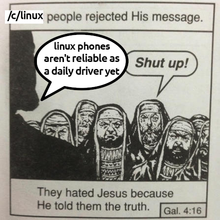 pH3ra@lemmy.ml to linuxmemes@lemmy.world · 2 years ago"But my friend runs a PinePhone as a daily driver"lemmy.mlimagemessage-square2linkfedilinkarrow-up11arrow-down10