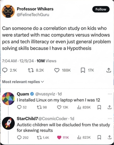 minus-squarefloquant@lemmy.dbzer0.comlinkfedilinkarrow-up0·6 months agoEh, windows definitely throws more shit to fix at you. Macs either work or need to be taken to an apple store