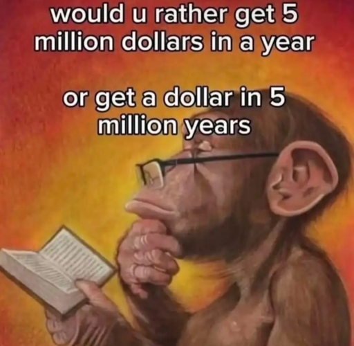 minus-squareHereIAm@lemmy.worldlinkfedilinkarrow-up0·26 days agoThen why not take the 5mil dollars and invest it for 5mil years?