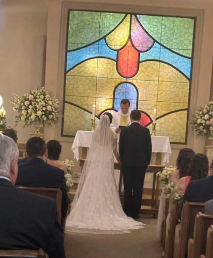 Probably AI, the bride’s arm is sus, the altar furniture too (central pedestal with very narrow support, likely hallucinated to match table legs) and the stained glass is divided into uneven 4x4 segments with lines that are thinner than the design’s, which is unusual. Also, no other images of this stained glass online, apparently, and it has been posted to some “cursed AI” groups.